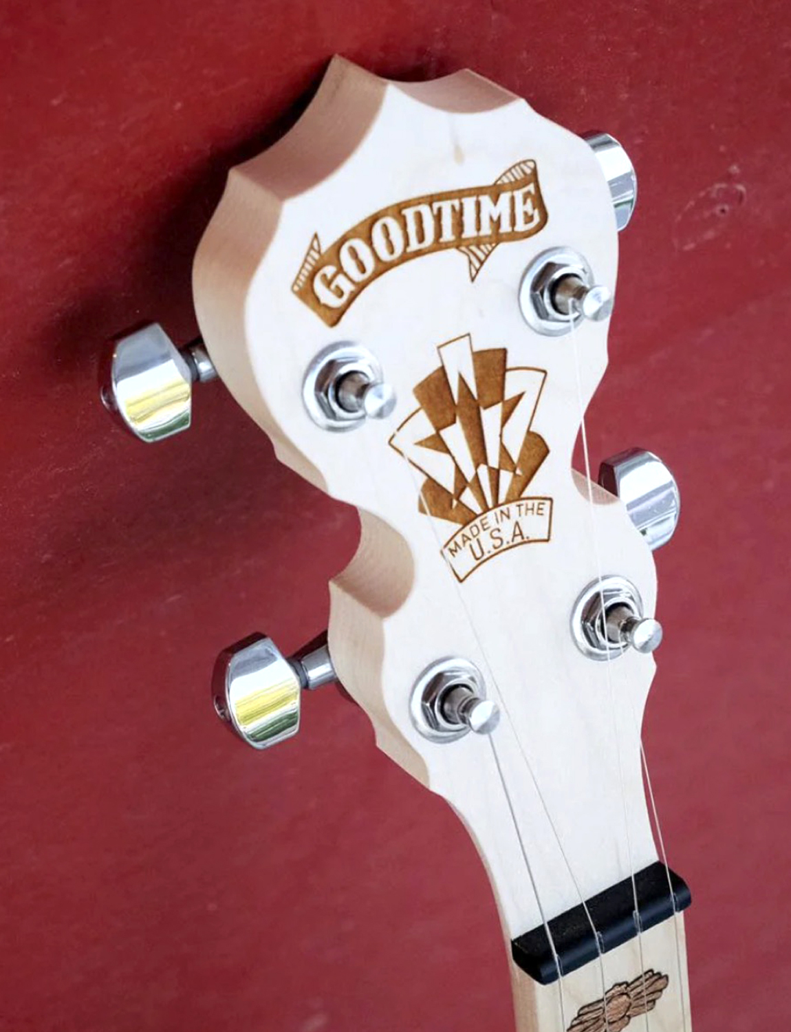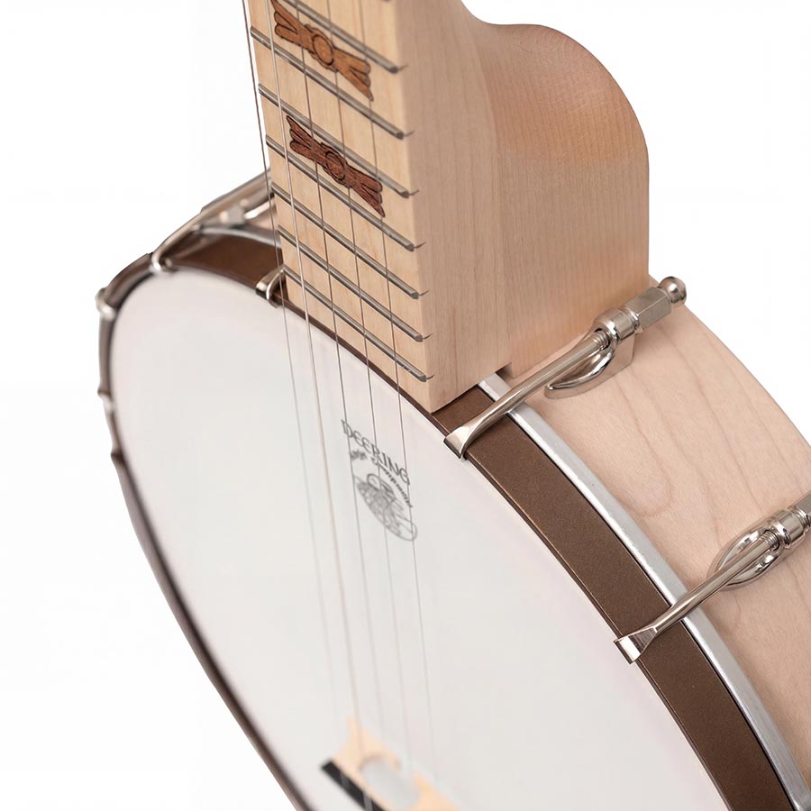 Ahorn hell, Openback, 11″-Kessel, Metallteile bronzefarbig pulverlackiert, Ärmelschoner, Besondere Kopfplattengravur, Neues Griffbretteinlagen-Design, OGB