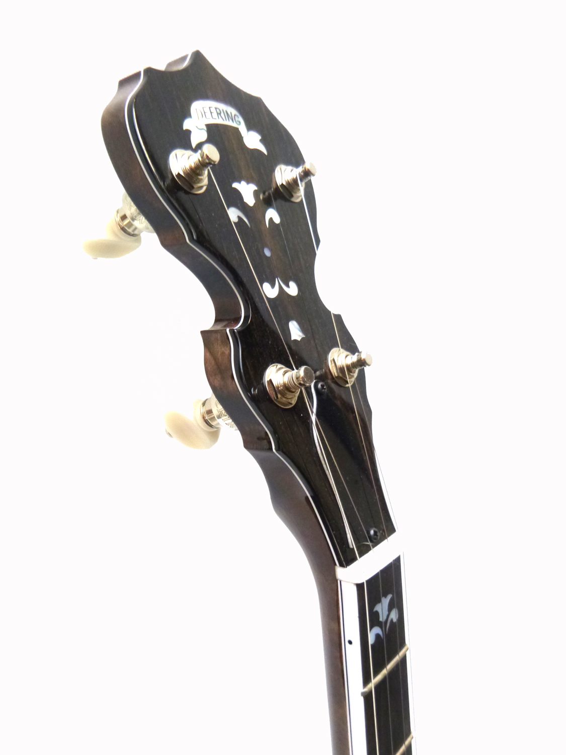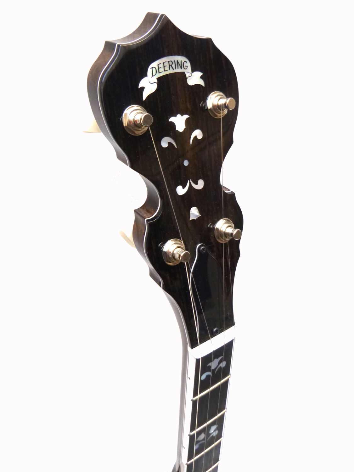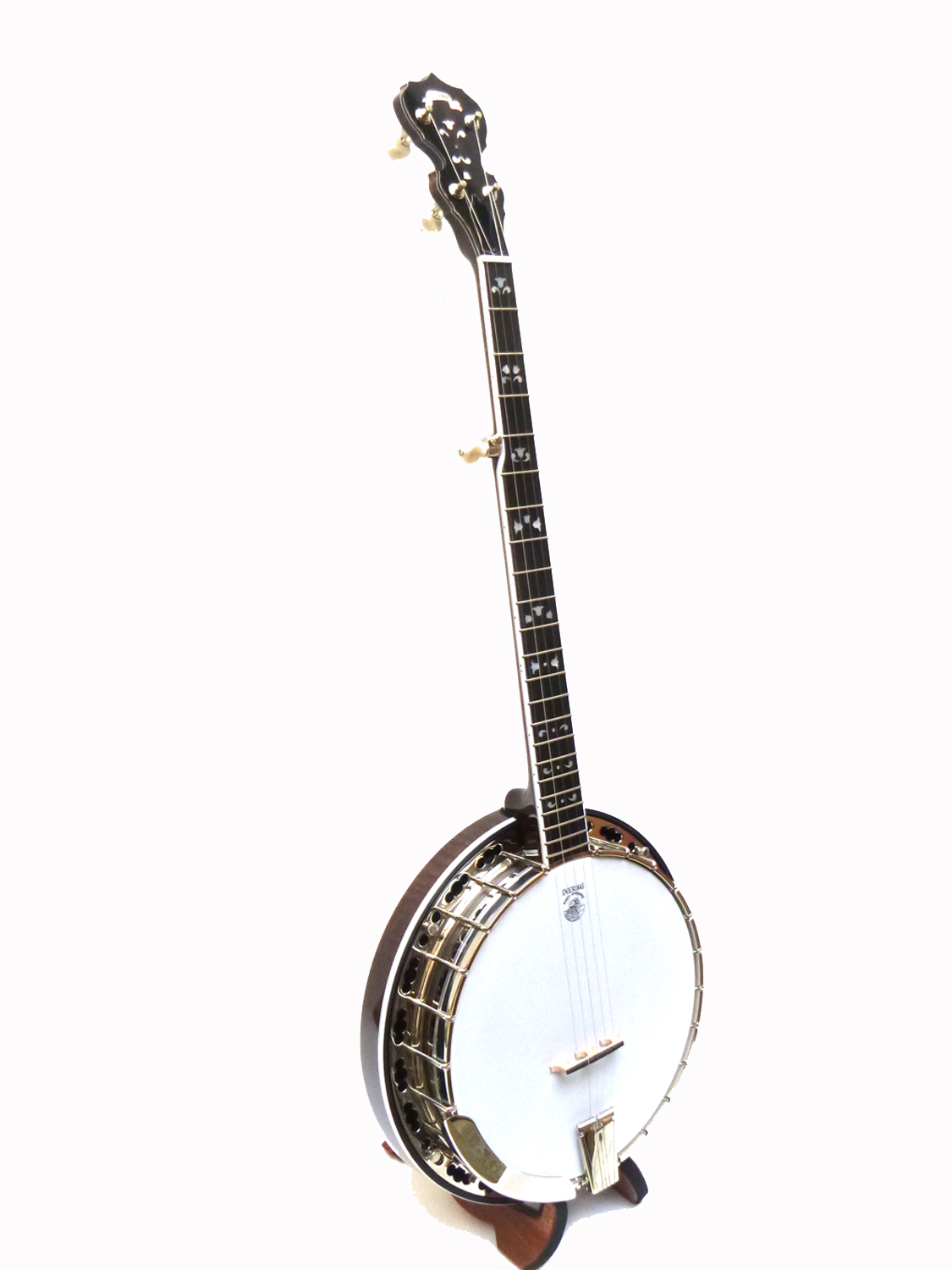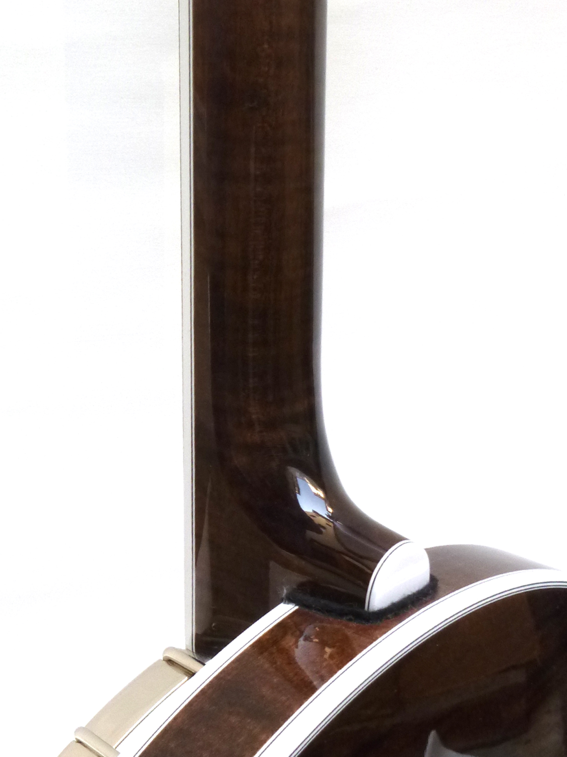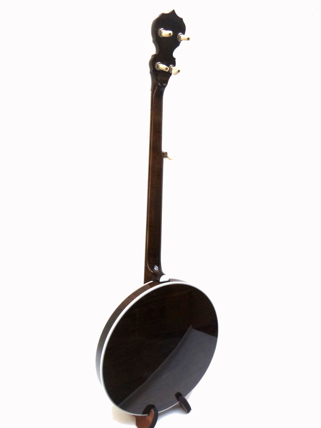 Ahorn Nussbaumfarbig Gebeizt, Hochglanz, Gewölbtes Ebenholzgriffbrett, Caponägel (7,8,9,10), Perlmutteinlagen, Tonring aus Glockenbronze, OHK