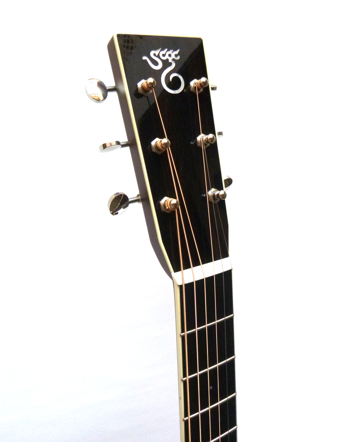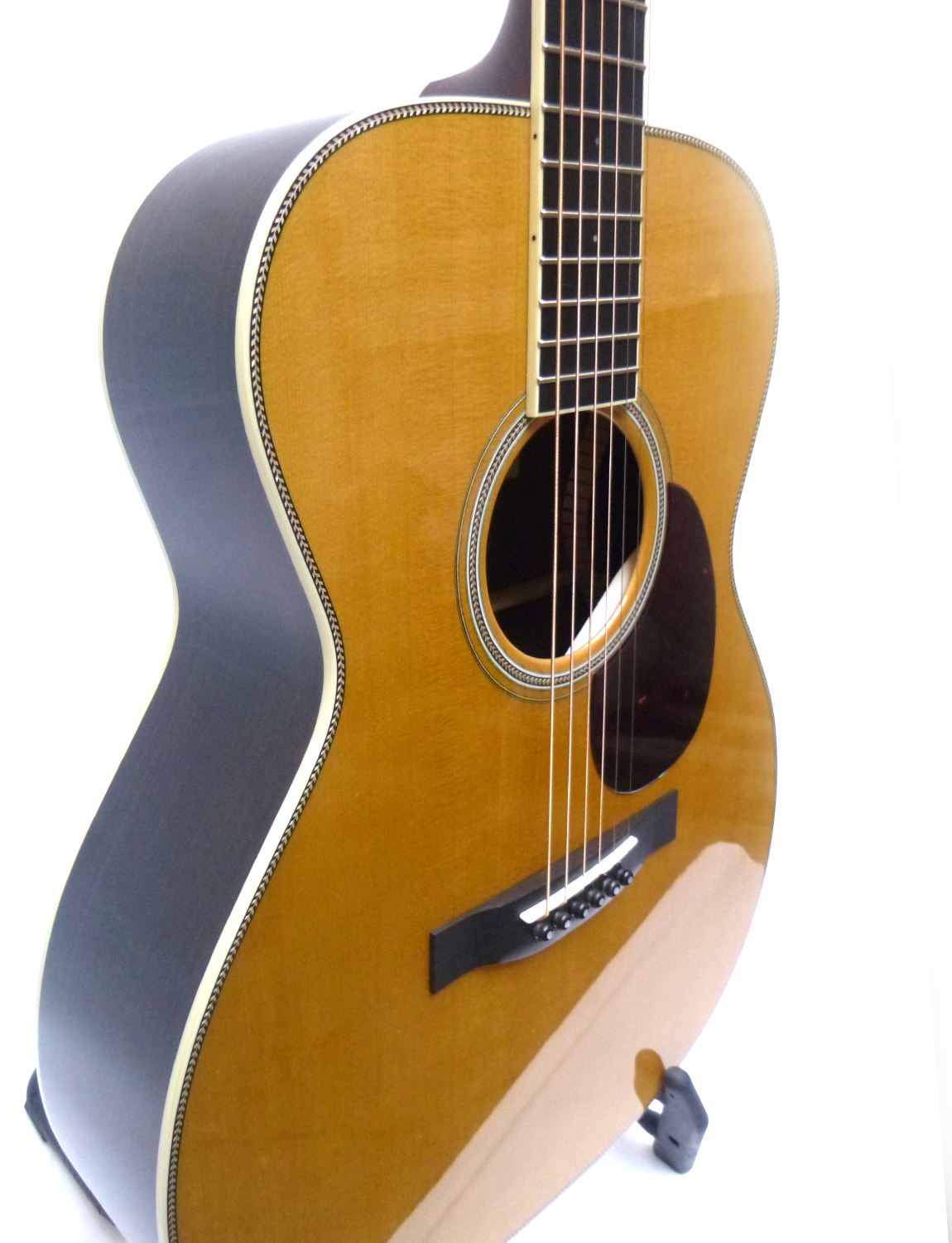 Sitka Fichtendecken massiv, Adirondack-Balken mit heissem Knichenleim verleimt, Zargen und Boden ostindischer Palisander massiv, Advanced X-Bracing, OHK