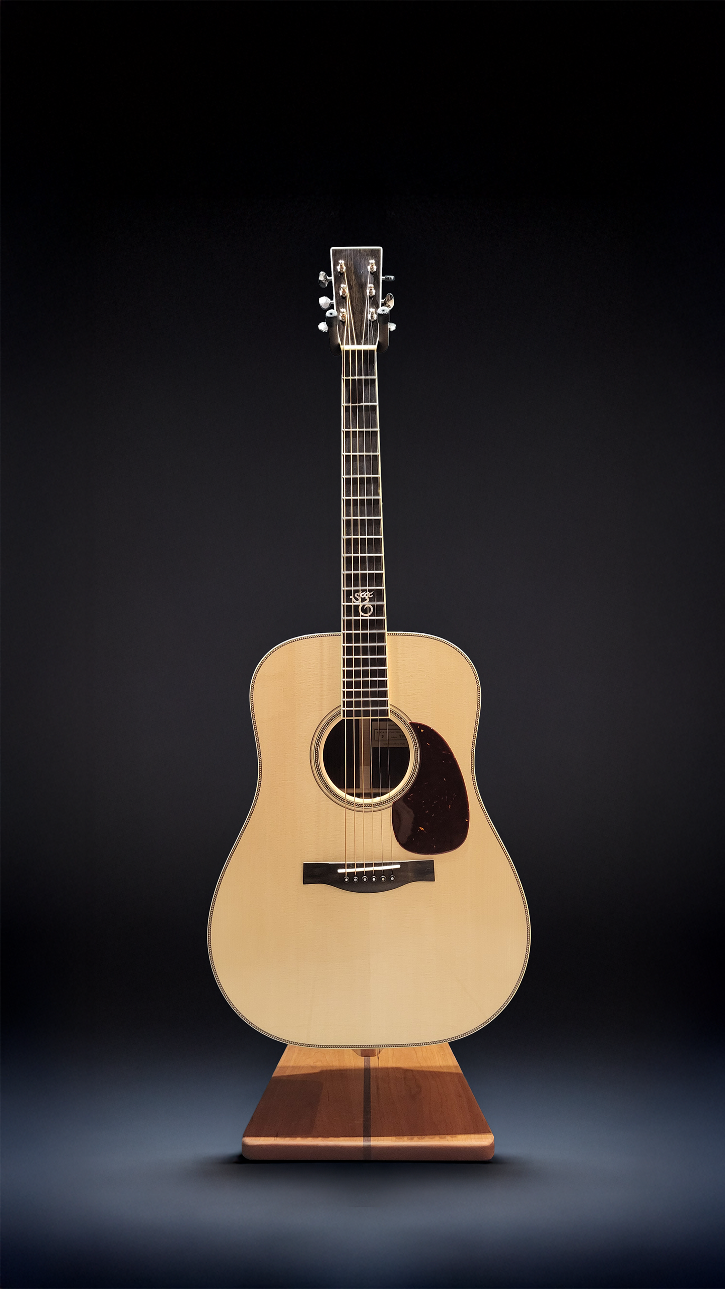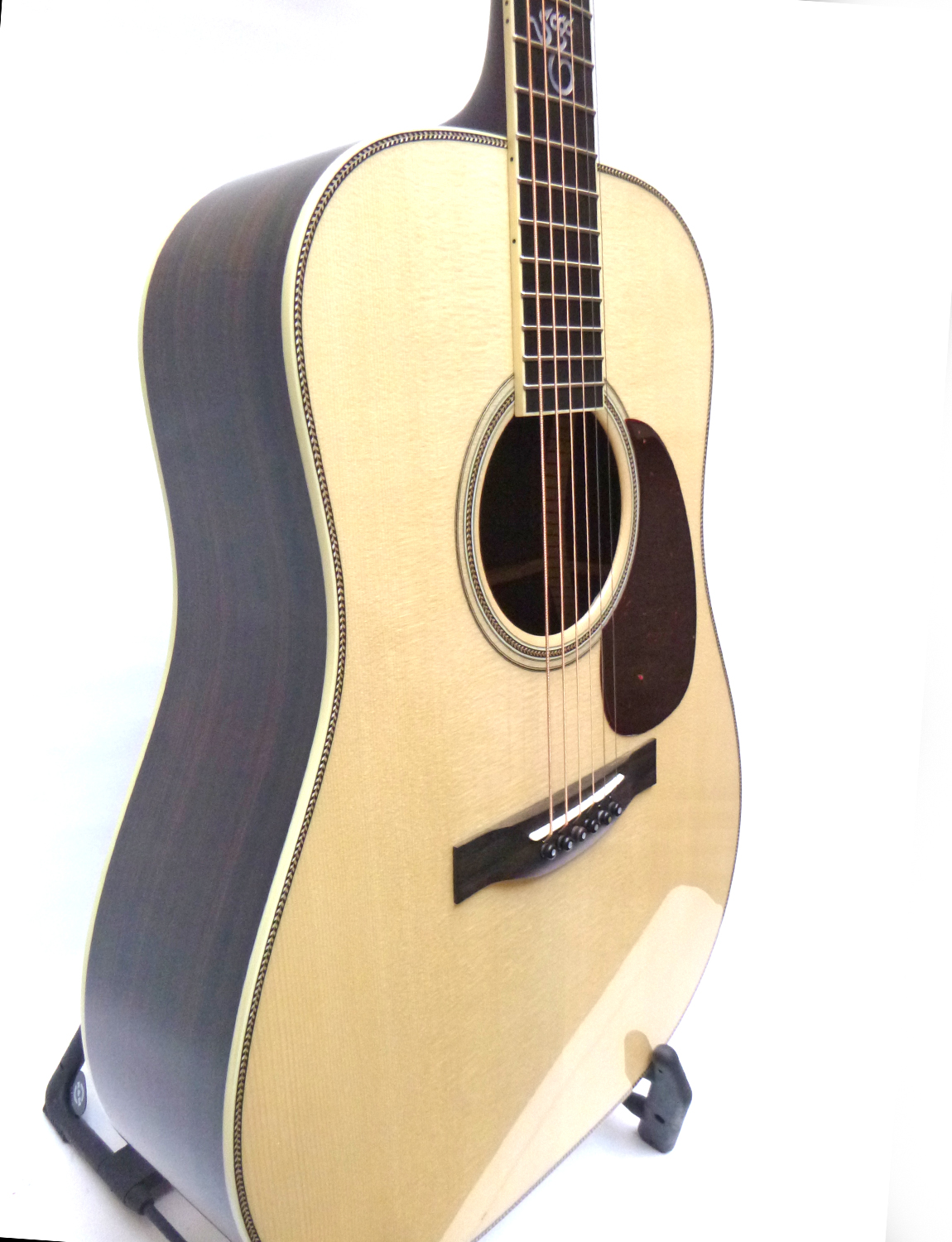 Fichtendecke aus Bergün (Mondholz) massiv, Adirondack-Balken mit heissem Knochenleim verleimt, Zargen und Boden ostindischer Palisander massiv, Ivoroid Binding an Kopfplatte, OHK