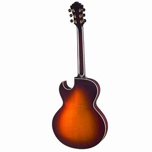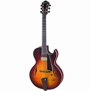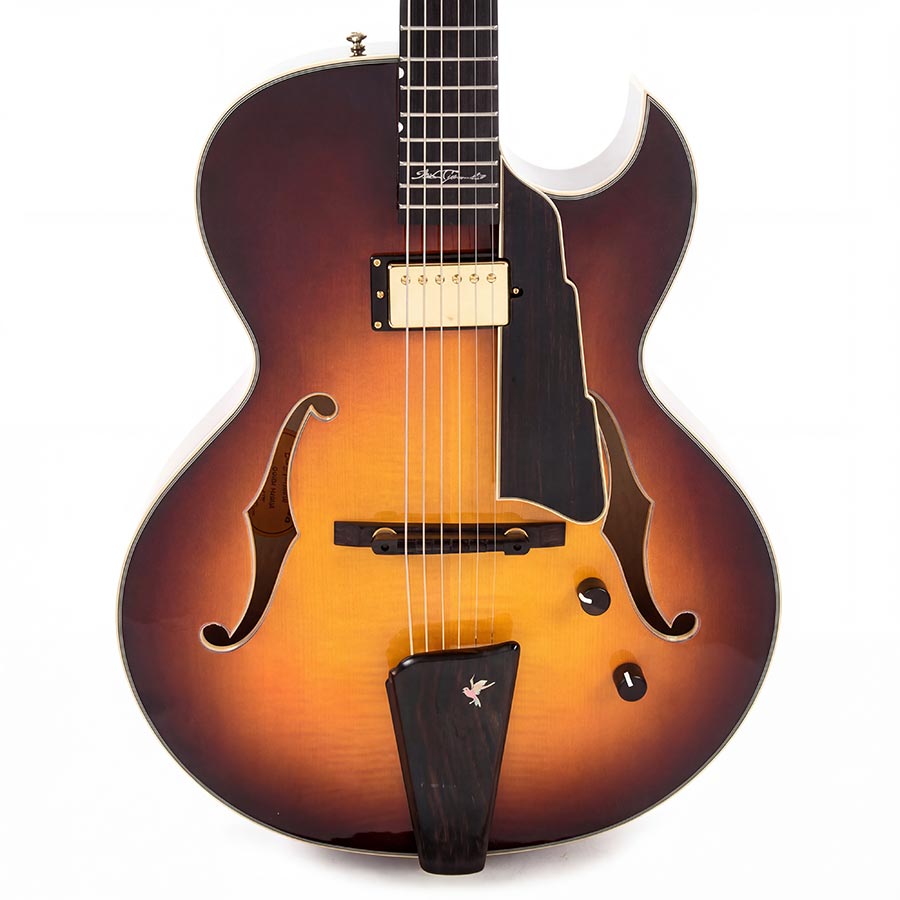 Limitierte John Pisano Signature Archtop mit flammenahornfurnierter Decke und hochwertiger Elektronik. Seymour Duncan Humbucker, Pisano-Design-Elemente und kurze Mensur. Elegantes Instrument für stilvolle Klangvielfalt.