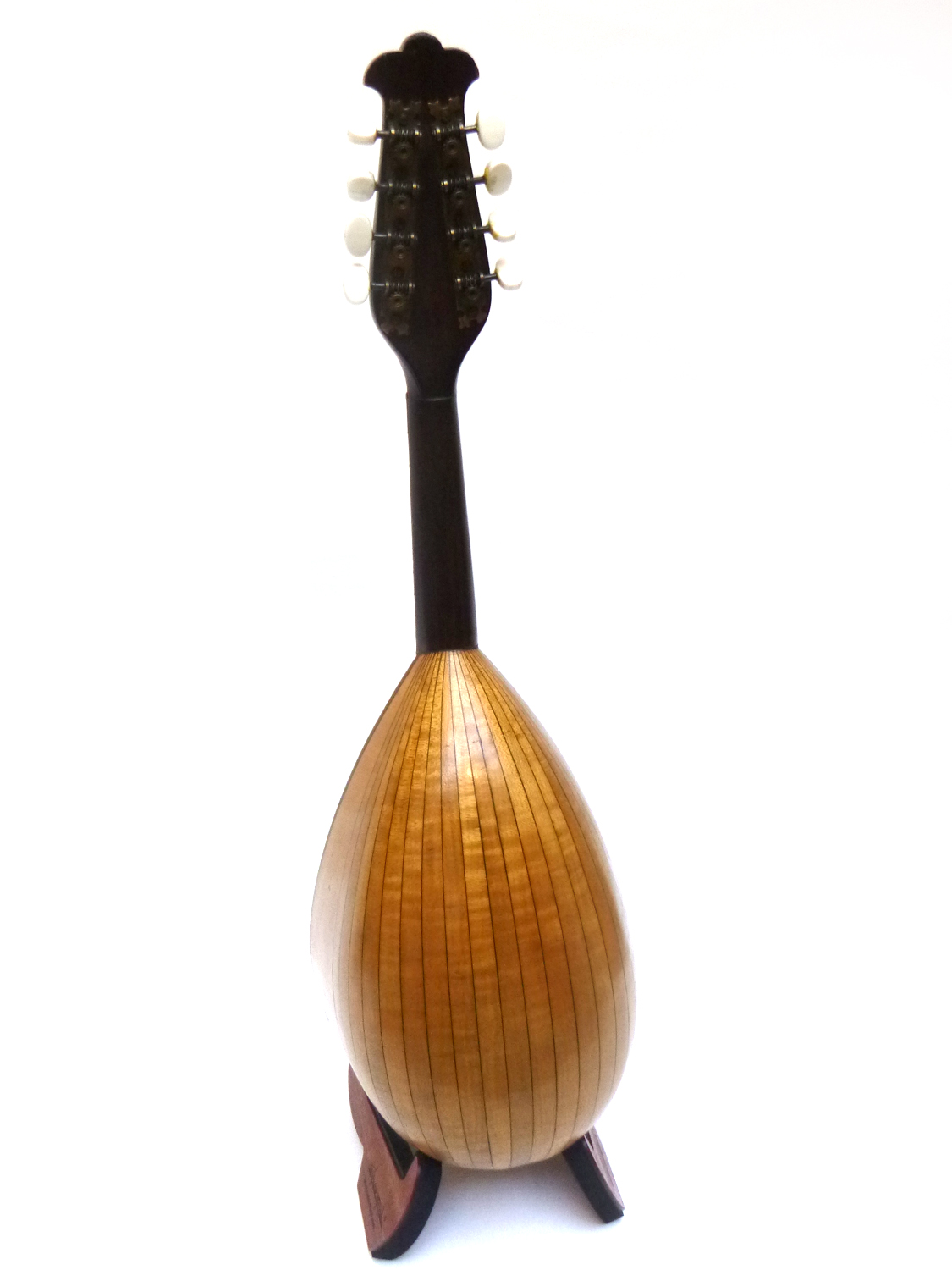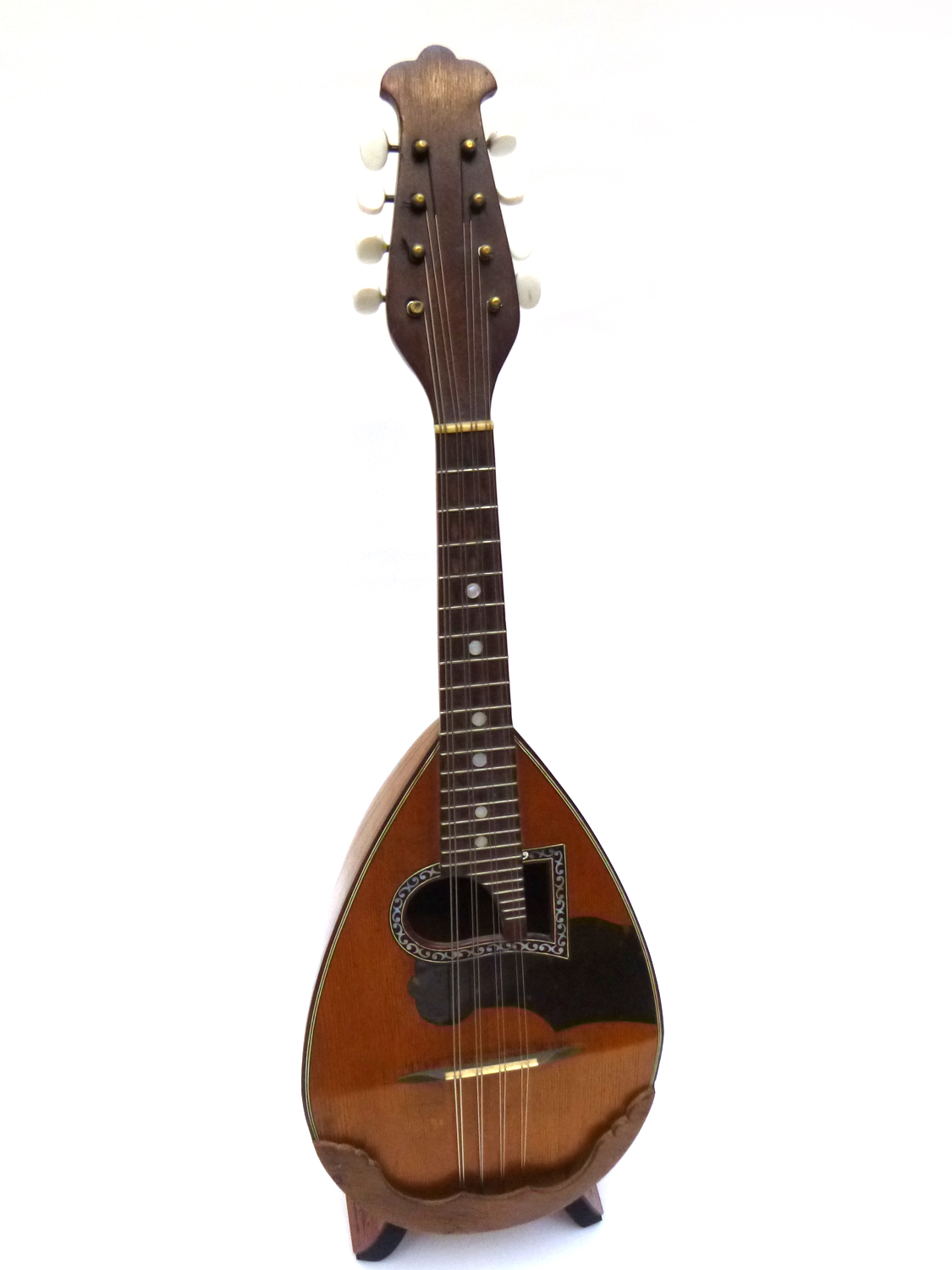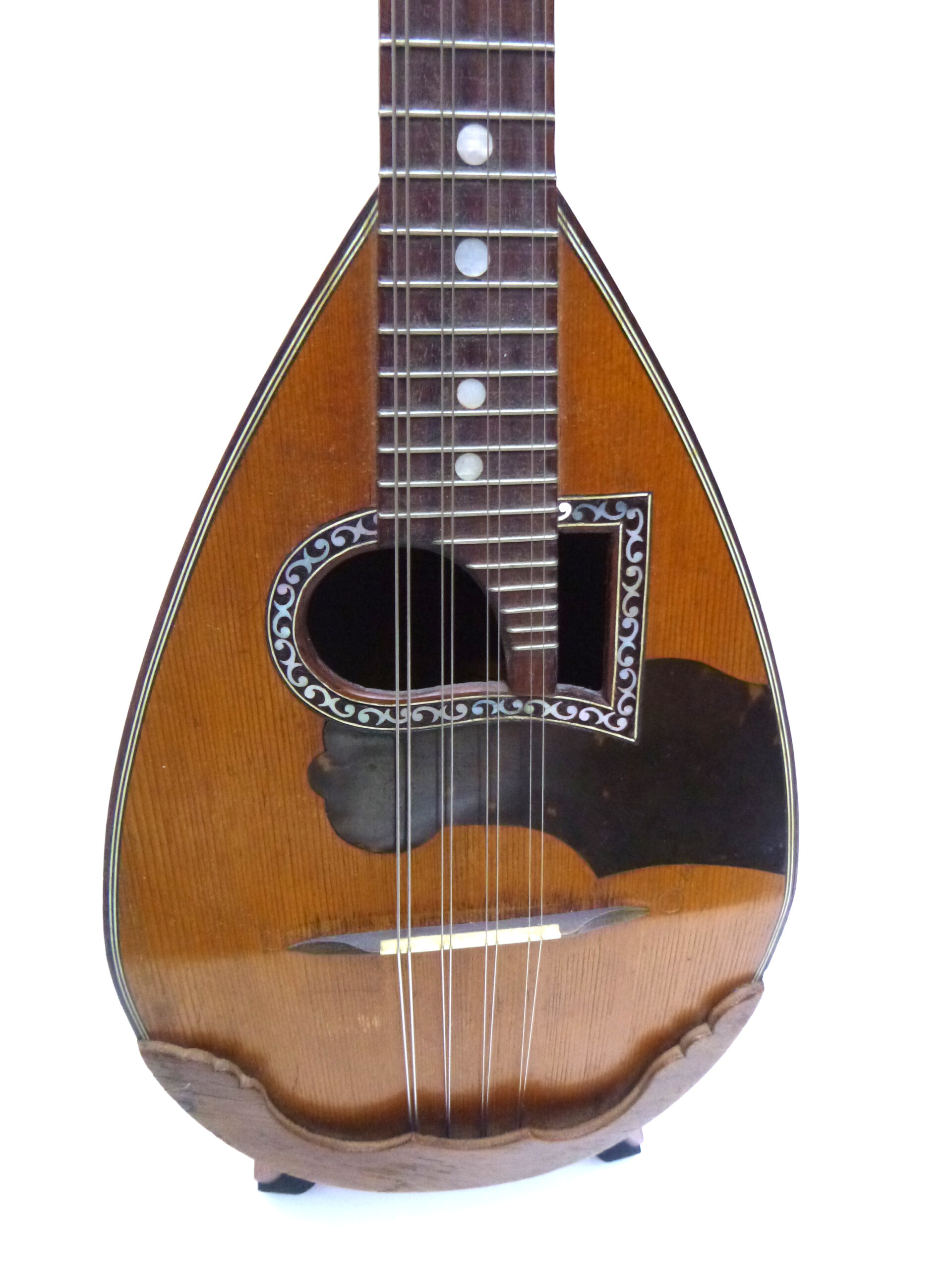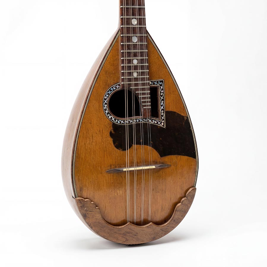 Bj. 1935, Sehr guter Zustand, Italienische Form, Fichtendecke und Ahornmuschel, Perlmuttverziertes Schallloch auf Basseite rund, auf Diskantseite Eckig